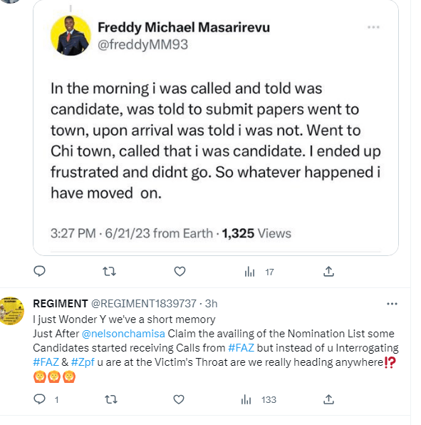 In an interview with Chaminukanews24, Mr Terrence Khumbula a double candidate in Hunyani constituency said, that upon submitting all the papers to the party office, he was called on the eve of the nomination court that he was the successful candidate.
