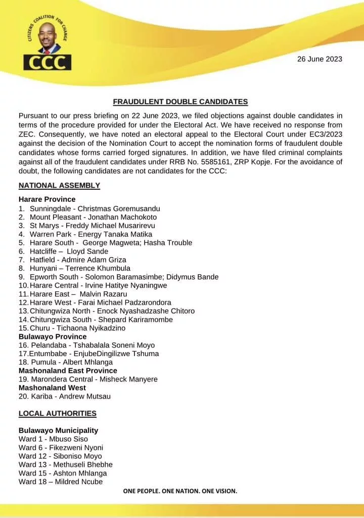 Below is a List of double candidates announced by Fadzai Mahere CCC spokesperson